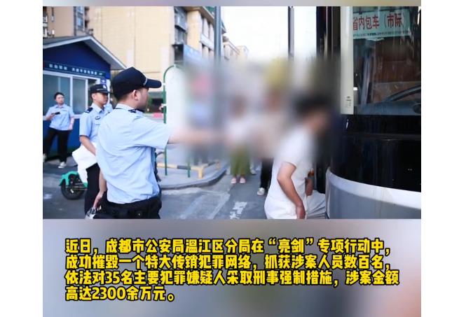 目前,涉案35名主要犯罪嫌疑人已被温江公安分局依法采取刑事强制措施。同时,温江公安分局会同区市场监管部门对297名涉传人员分别给予行政处罚并全部劝返回原籍。