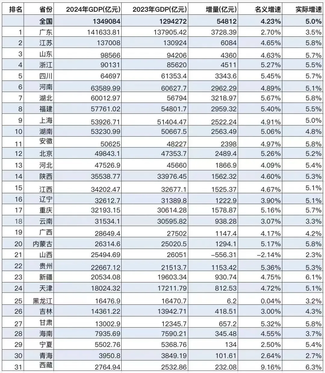 比较地方经济的发展速度,按现价计算的名义GDP增速,比按不变价计算的实际GDP增速更有参考价值。目前,全国31个省份(不含港澳台)均已公布2024年GDP数据,各省份的GDP名义增速排名如何?