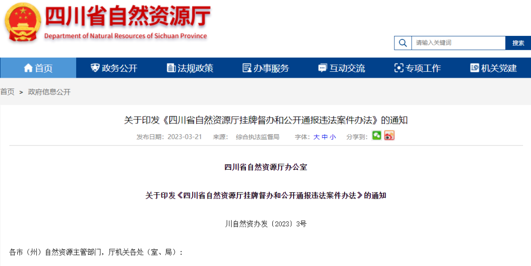为进一步加大四川省自然资源重大、典型违法案件查处力度,有效遏制违法行为,切实维护全省自然资源管理工作秩序,近日,《四川省自然资源厅挂牌督办 和公开通报违法案件办法》正式印发。