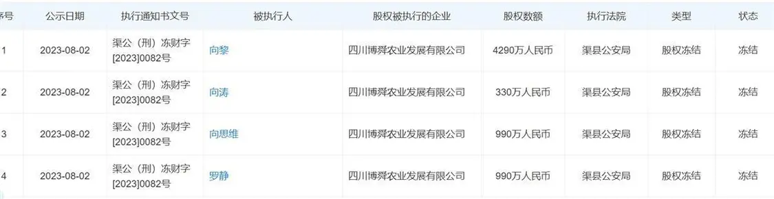 天眼查显示,向黎在多家担任法定代表人或股东的企业的股权均被冻结,涉及的金额有数千万元。其中涉及金额最多的一家企业是四川博舜农业发展有限公司,该公司注册实缴资本6600万元,向黎在该公司持股65%。2023年8月,向黎在该公司的股权被渠县公安局冻结,涉及金额四千多万元。此外,在征集违法犯罪线索名单中的向涛和向思维,也在四川博舜农业发展有限公司持有股权,均被冻结。