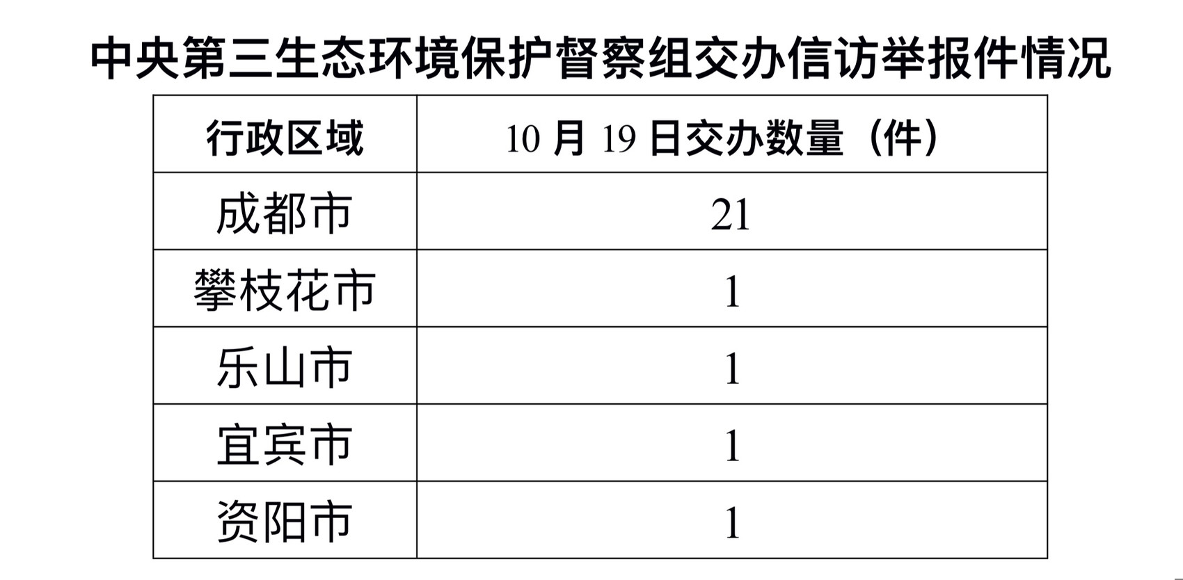 10月19日,中央第三生态环境保护督察组向四川移交第一批群众信访举报件25件(来电举报25件,来信举报0件),其中重点关注3件。