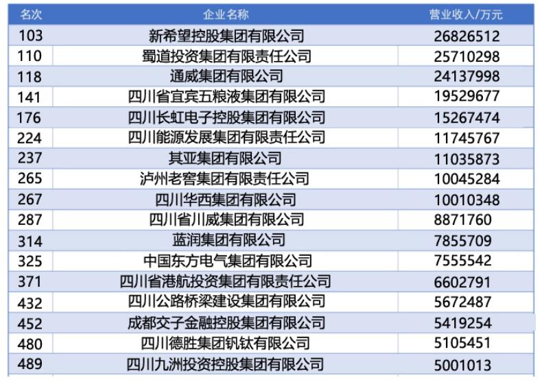 榜单显示,17家上榜四川企业中,排名进入前200的有新希望控股集团有限公司、蜀道投资集团有限责任公司、通威集团有限公司、四川省宜宾五粮液集团有限公司、四川长虹电子控股集团有限公司。其中,新希望控股集团有限公司排名第103位,位列四川首名。