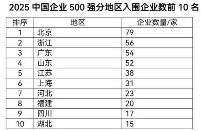 中国企业500强共分布在30个省(自治区、直辖市)中,分布最多的五个地区依次是北京、浙江、广东、山东和江苏。四川以17家公司位列第九,具体如下: