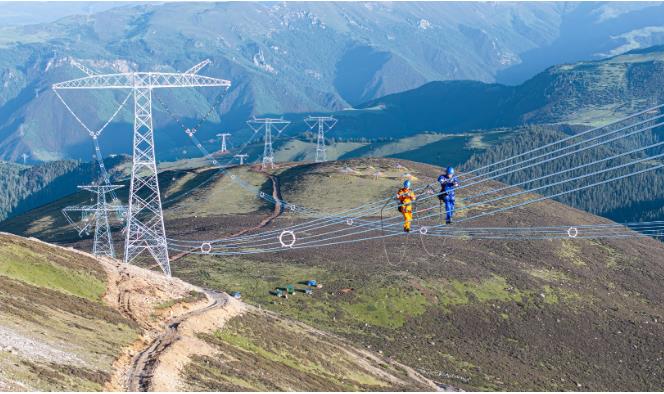 金上—湖北特高压工程是首个深入川藏高原腹地的特高压工程,直面地域与技术的双重“无人区”。送端换流站海拔3720米,线路最高海拔超4800米,建设环境面临高寒缺氧、地质复杂、有效施工期短、生态脆弱等极端挑战。各参建单位克服重重困难,跨越长江,翻越横断山脉,挺进川藏高原腹地,圆满完成工程建设任务。在工程建设难度最大的四川段,线路穿越横断山脉,途经林区覆盖率超70%、坡度超40度的陡峭山地。建设团队采用高原专用机械设备,通过组合流动起重机方式组塔,按期完成最高塔的组立,创造了世界最高海拔特高压工程施工纪录。工程牛背山段穿越27公里无人区,山路狭窄且崎岖,地形呈“刀背”状。建设者们架设货运索道82条,借助骡马、运输车、“爬山虎”、挖掘机等辅助运输塔材物资,多点并进成功解决了运输难题。