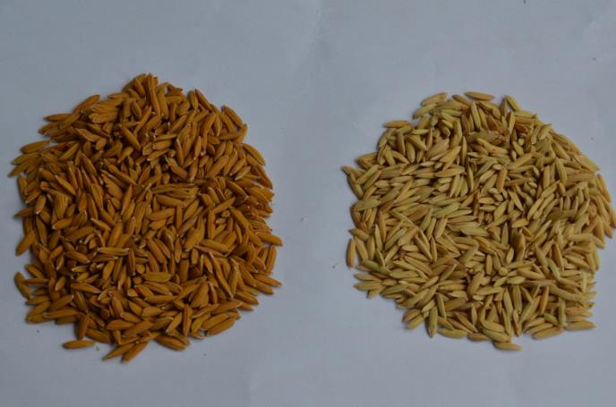 在四川省水稻航天育种工程研究中心的展示柜上,摆放着两种稻谷。一种的稻壳是正常的黄白色,另外一种则呈现出红褐色。红褐色的稻谷,是稻谷经过太空诱变后的后代。这次颜色基因的变异,对于水稻育种来说,是一个重要的发现。