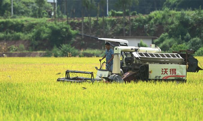 8月25日,蓬安县罗家镇泥巴寺村的高标准农田里,数台大型联合收割机正开足马力、来回穿梭,切割、脱粒、粉碎稻秆一气呵成,转眼间,一片片金黄的稻谷便尽数归仓,田间地头洋溢着丰收的喜悦。