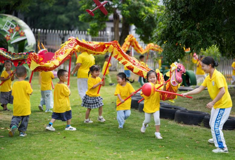 9月5日,四川泸州白酒产业园区天骄托育园的老师带领孩子们舞龙。新华社记者 江宏景 摄