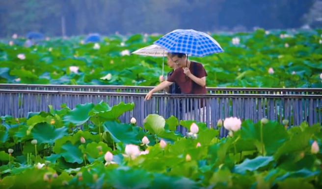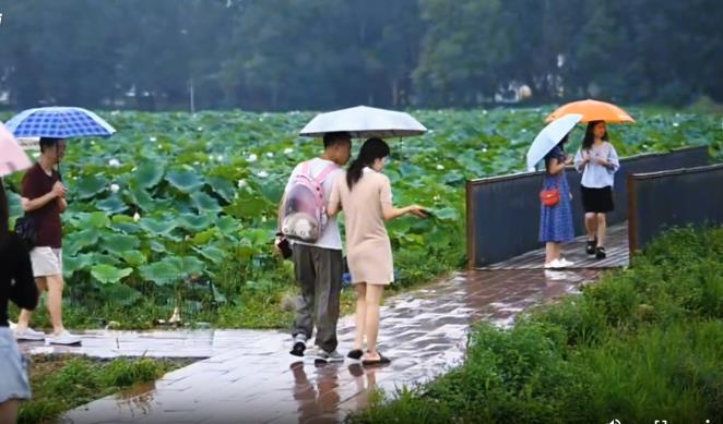 此时,有人缓行栈道冒雨去捕捉雨雾中的花影,有人三、两成双在雨幕下连缀成行,阔别已久的三圣乡荷塘美景在这雨中已构成一幅幅浪漫画卷。