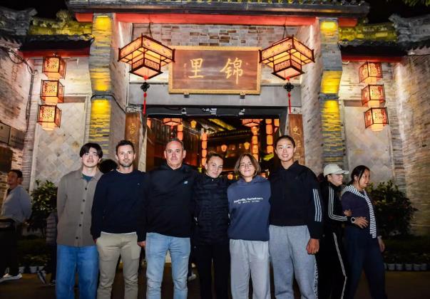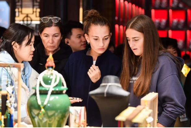 夜幕降临时,灯笼次第亮起,锦里的夜景愈显迷人。球员们在这条被称为“成都版清明上河图”的街巷中流连忘返,沉醉于灯火阑珊中的别样风情。青石板路映照着灯笼的光晕,整条街巷人声鼎沸,瞬间将球员们带到成都最具烟火气的市井繁荣中。他们自如地汇入人流,在喧嚣的声浪和食物的香气中穿行,更被吹糖人、糖画、剪纸等非物质文化遗产的活态展示所吸引,不时驻足拍照打卡。在熙攘的人群中,中国球员张瑞恩显得格外轻松:“因为我是‘半个四川人’,来到成都其实等于回家了。在这边比赛、旅游是很有意义的一件事情。”她的笑容里满是对成都的赞许。