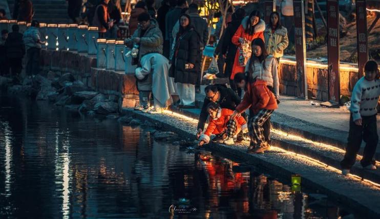 同一时间,在古城西街西牌坊护城河畔,上百名市民游客点亮河灯,放入潺潺流水中。一盏盏河灯带着新春的祝福与期许,顺着河水缓缓流淌,与岸边巡游的花灯交相辉映。