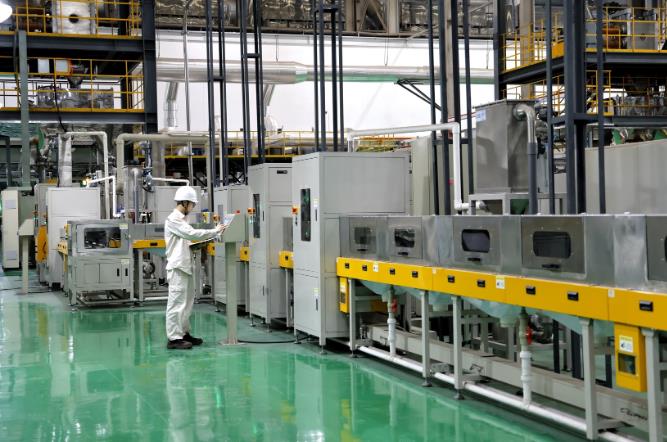 四川协鑫锂电科技有限公司内,工人正在操作全自动生产设备。